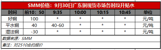 9月30日广东铜现货市场各时段升贴水(第一时段9:30)【SMM价格】