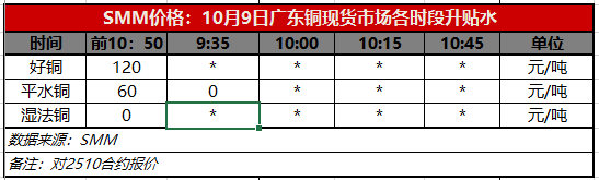 10月9日广东铜现货市场各时段升贴水(第二时段10:00)【SMM价格】
