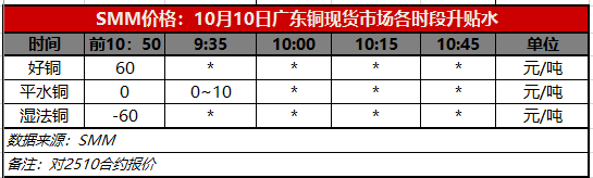 10月10日广东铜现货市场各时段升贴水(第二时段10:00)【SMM价格】