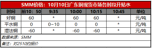 10月10日广东铜现货市场各时段升贴水(第三时段10:15)【SMM价格】
