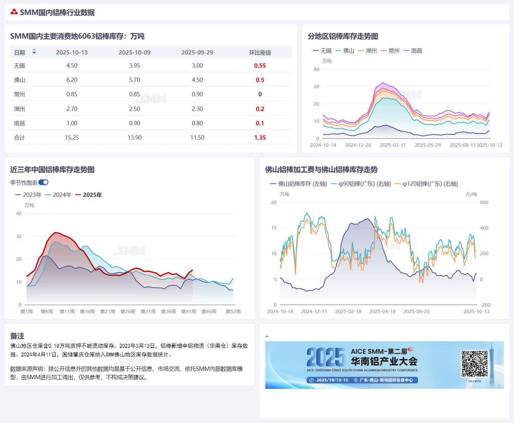 据SMM统计,10月13日国内主流消费地铝棒库存15.25万吨,较上周四库存上涨1.35万吨,较上周一库存上涨3.75万吨。