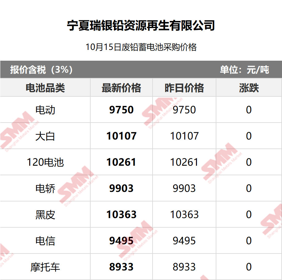 SMM 2025/10/15 国内知名再生铅企业废电瓶采购报价