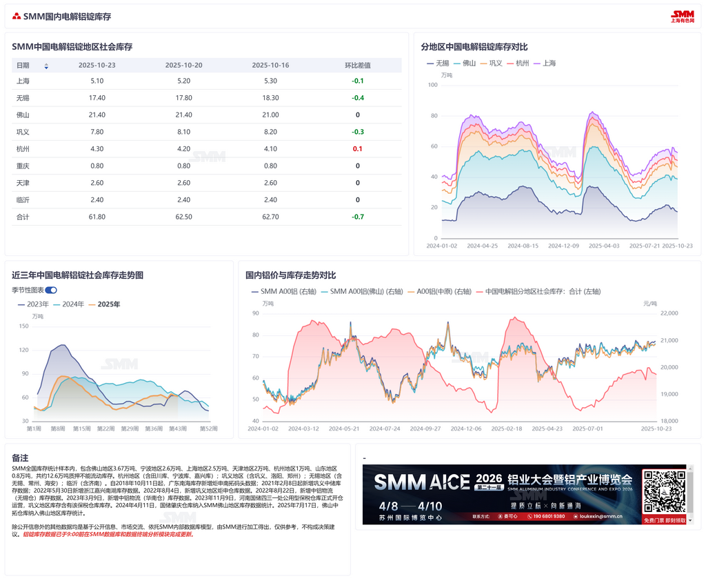 2025年10月23日电解铝锭:周四库存61.80万吨【SMM数据】