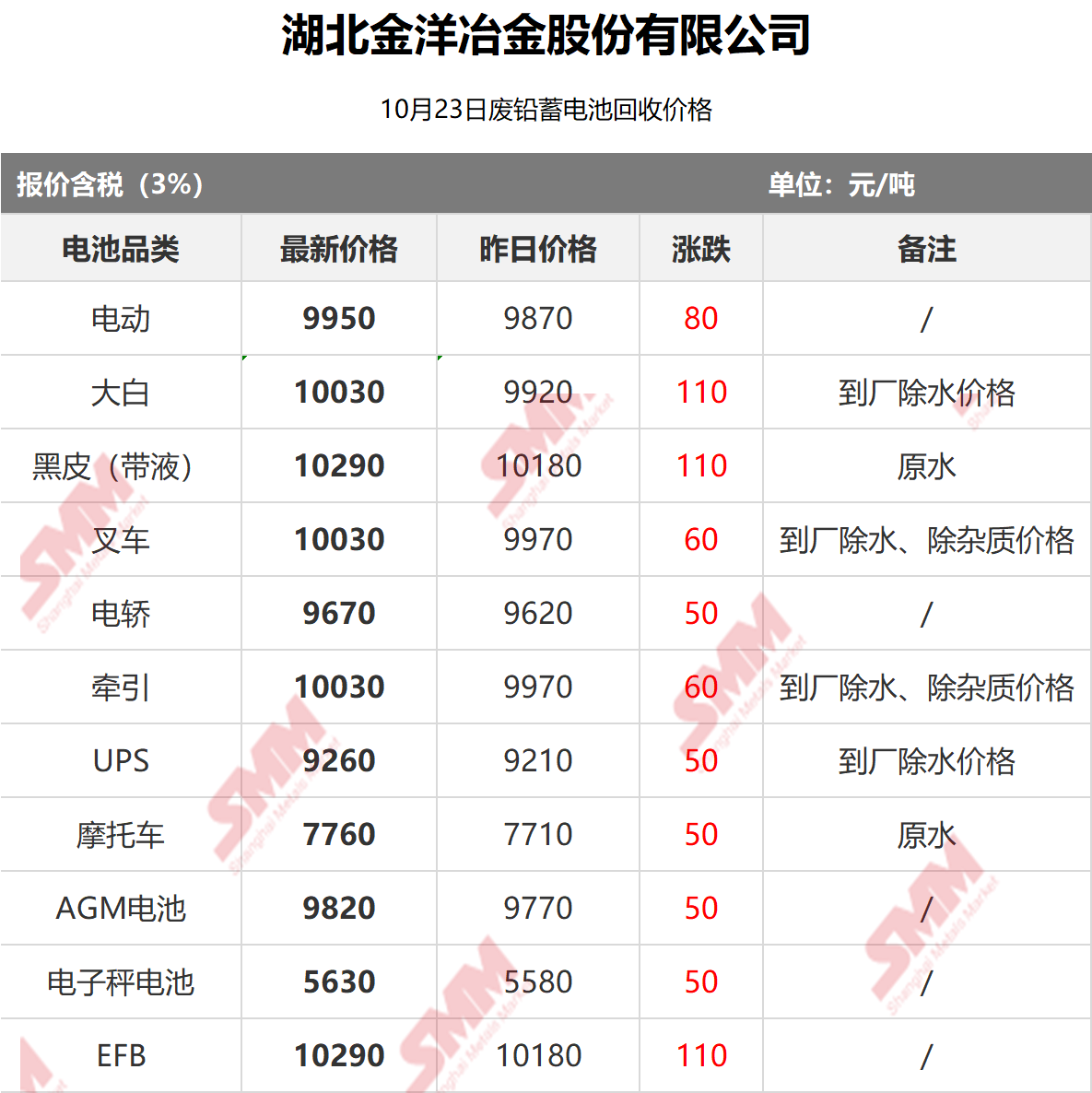 SMM 2025/10/23 国内知名再生铅企业废电瓶采购报价