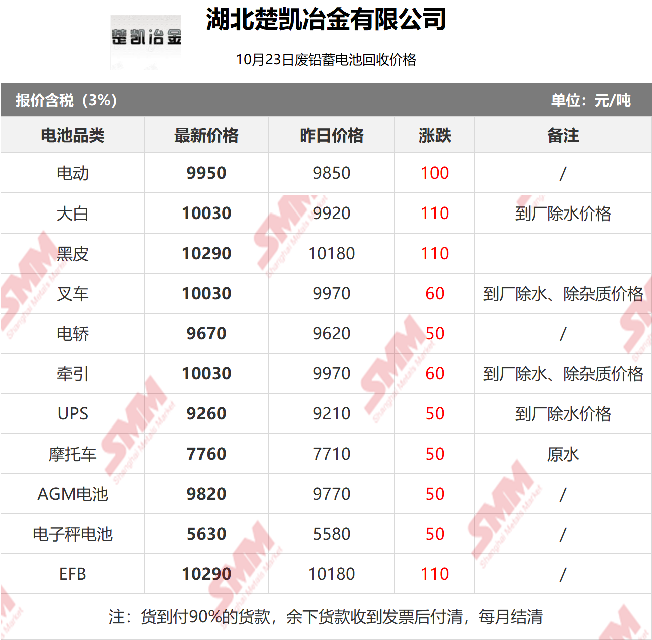 SMM 2025/10/23 国内知名再生铅企业废电瓶采购报价