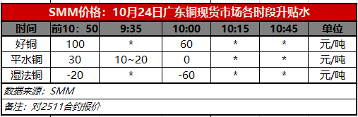 10月24日广东铜现货市场各时段升贴水(第四时段10:50)【SMM价格】