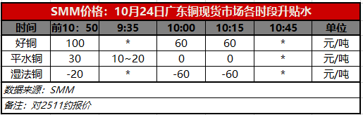 10月24日广东铜现货市场各时段升贴水(第二时段10:00)【SMM价格】