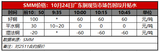 10月24日广东铜现货市场各时段升贴水(第四时段10:50)【SMM价格】
