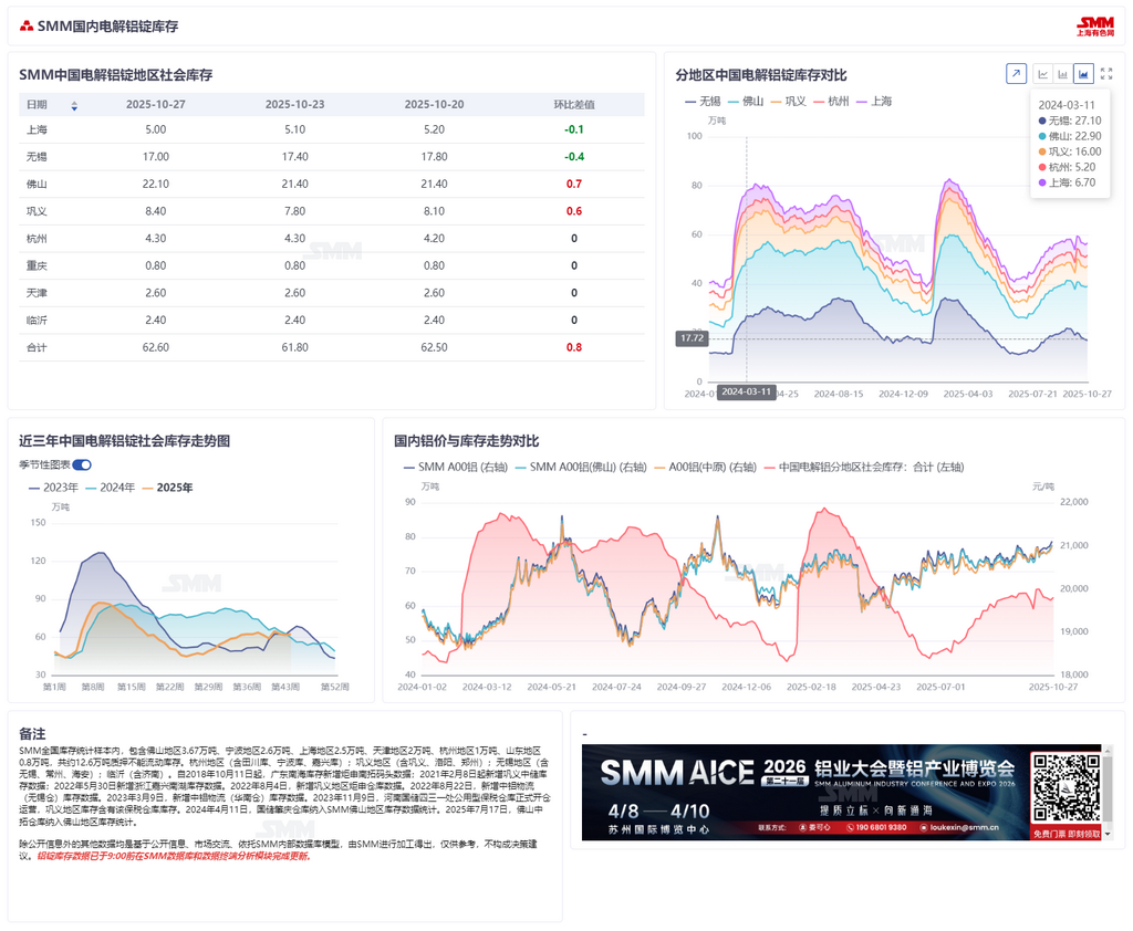 2025年10月27日电解铝锭:周一库存62.6万吨【SMM数据】