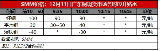 12月11日广东铜现货市场各时段升贴水(第二时段10:00)【SMM价格】
