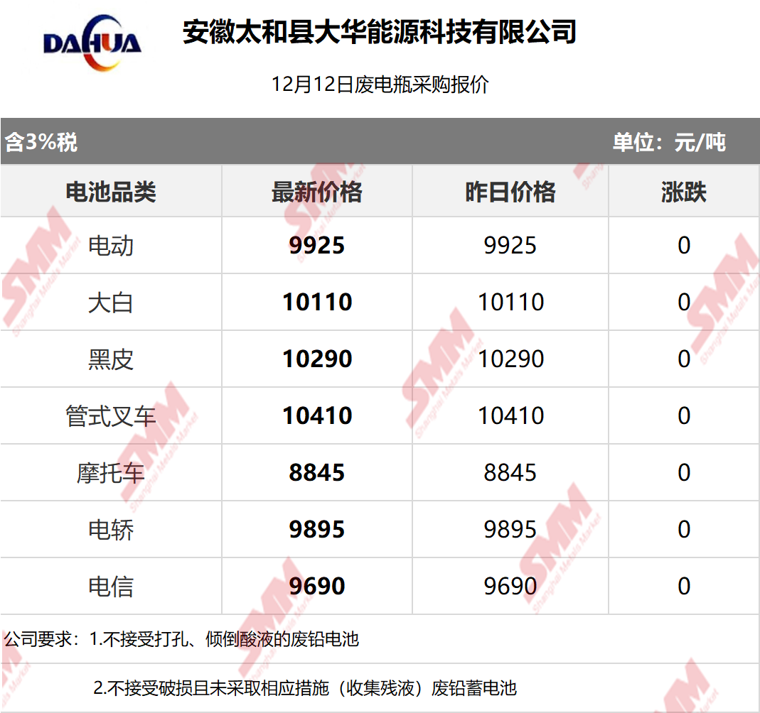 SMM 2025/12/12 国内知名再生铅企业废电瓶采购报价