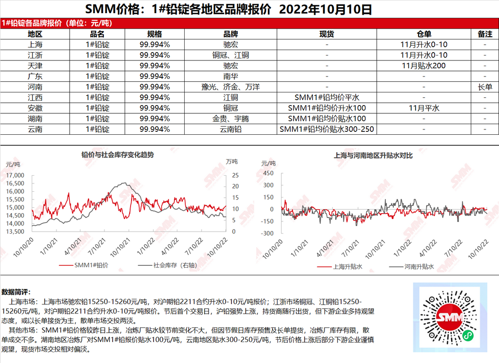 【SMM 上海及其他1#铅市场午评:节后首个交易日沪铅走势强劲 而下游接货普遍观望】SMM10月10日讯:上海市场驰宏铅15250-15260元/吨,对沪期铅2211合约升水0-10元/吨报价;江浙市场铜冠、江铜铅15250-15260元/吨,对沪期铅2211合约升水0-10元/吨报价。节后首个交易日,沪铅强势上涨,......