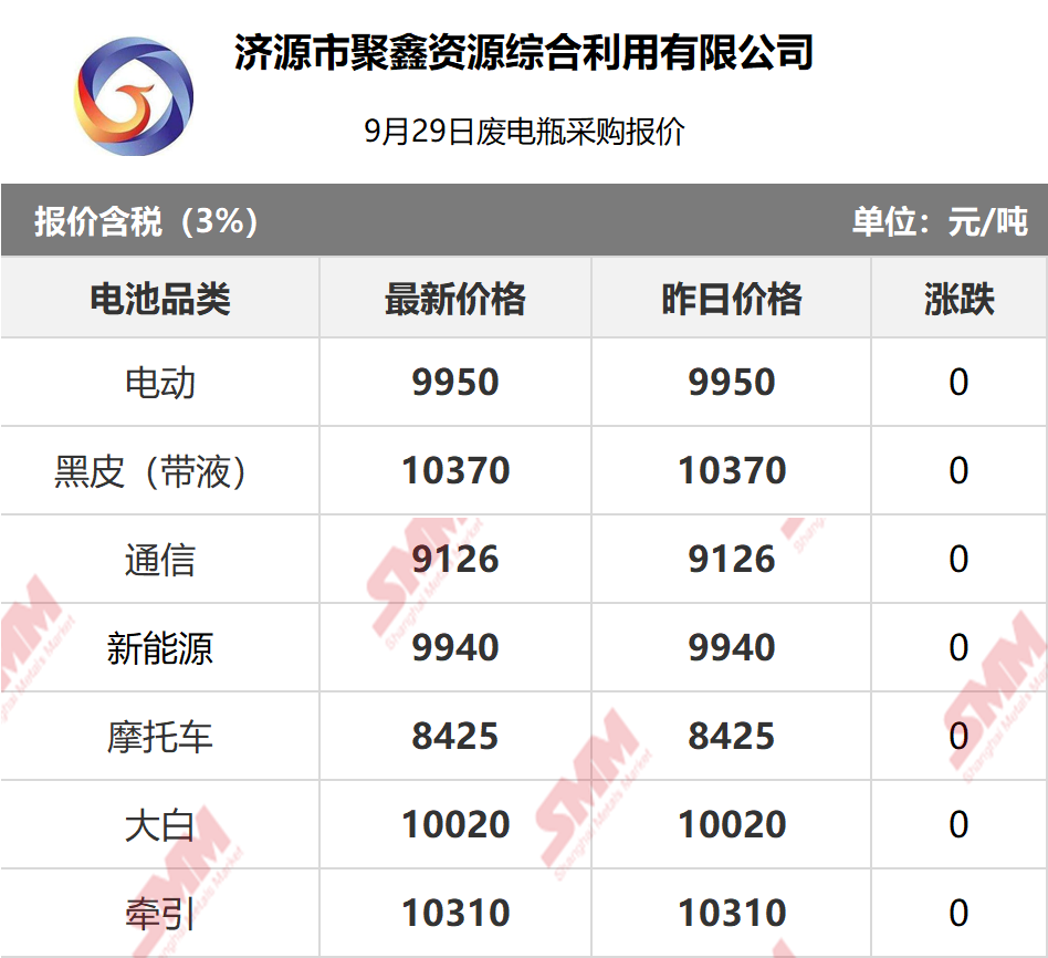 SMM 2025/9/30 国内知名再生铅企业废电瓶采购报价