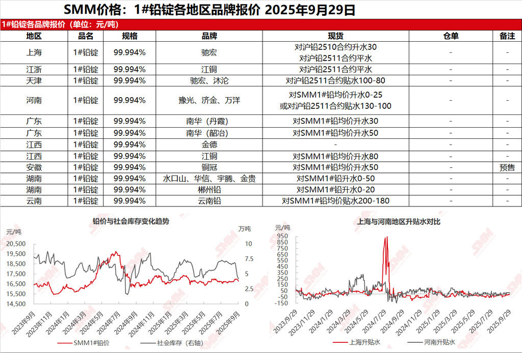 【SMM 上海及其他1#铅市场:铅价下挫刺激下游接货 而节前现货流通货源有限】 SMM9月29日讯:上海市场驰宏铅16900-16930元/吨,对沪铅2510合约升水30元/吨或对沪铅2511合约平水报价;江浙市场江铜铅16900-16930元/吨,对沪铅2511合约平水报价。早间沪铅意外直线下挫,市场观望情绪较浓......