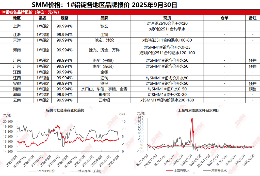 【SMM 上海及其他1#铅市场:铅市场节日气氛浓郁 部分企业已陆续放假】 SMM9月30日讯:上海市场驰宏铅16915-16935元/吨,对沪铅2510合约升水30元/吨或对沪铅2511合约平水报价。沪铅维持高位震荡态势,同时国庆假期在即,铅市场节日气氛较浓......