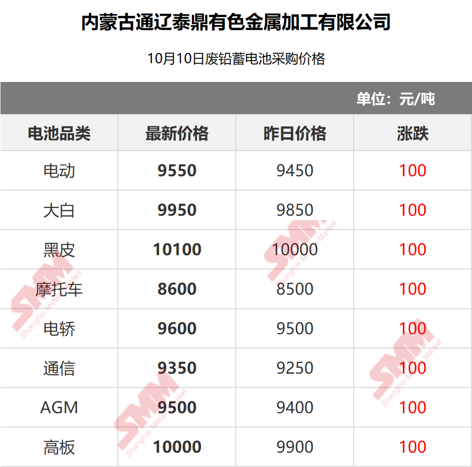 SMM 2025/10/10 国内知名再生铅企业废电瓶采购报价