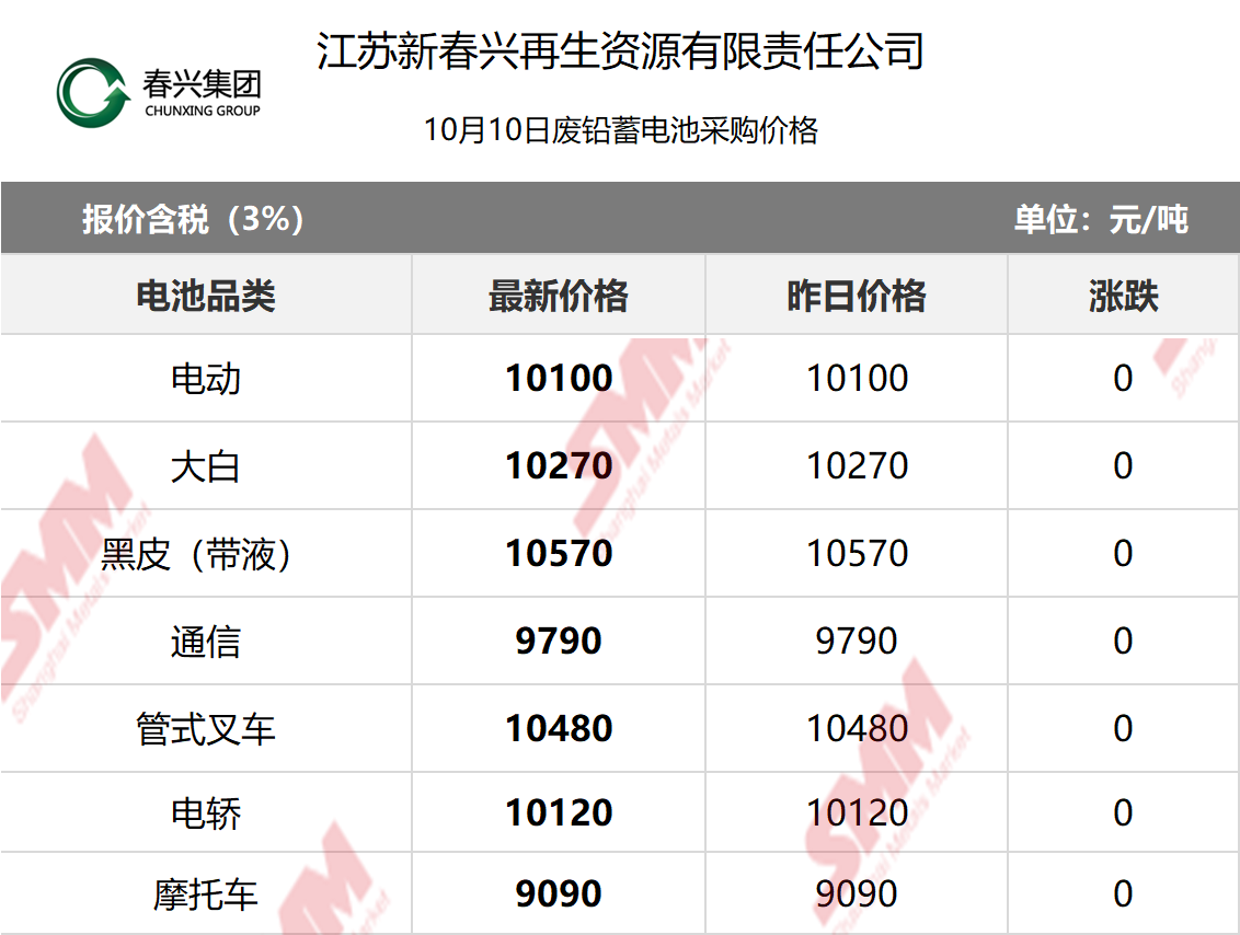 SMM 2025/10/10 国内知名再生铅企业废电瓶采购报价