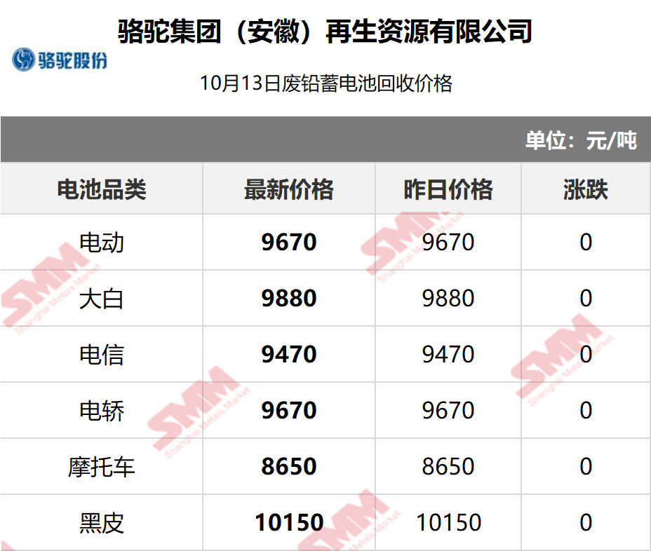SMM 2025/10/16 国内知名再生铅企业废电瓶采购报价