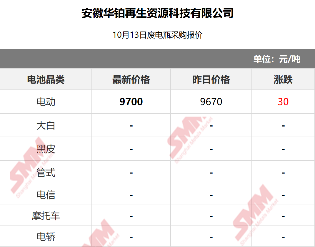 SMM 2025/10/13 国内知名再生铅企业废电瓶采购报价