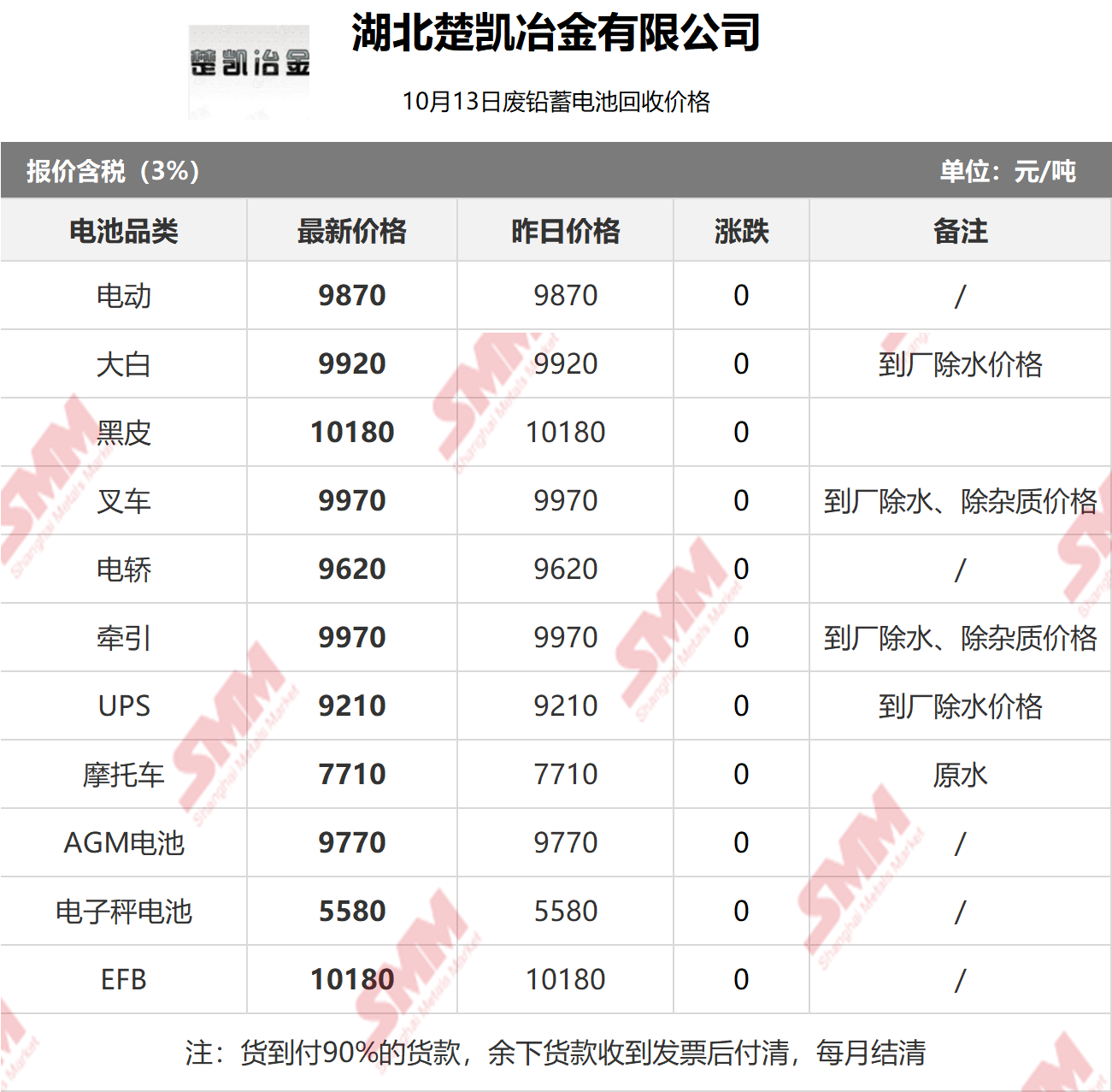 SMM 2025/10/13 国内知名再生铅企业废电瓶采购报价