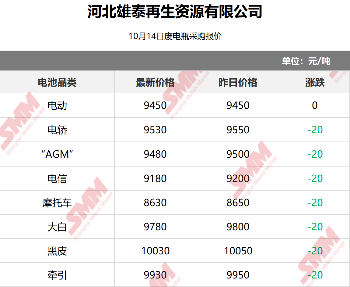 SMM 2025/10/14 国内知名再生铅企业废电瓶采购报价