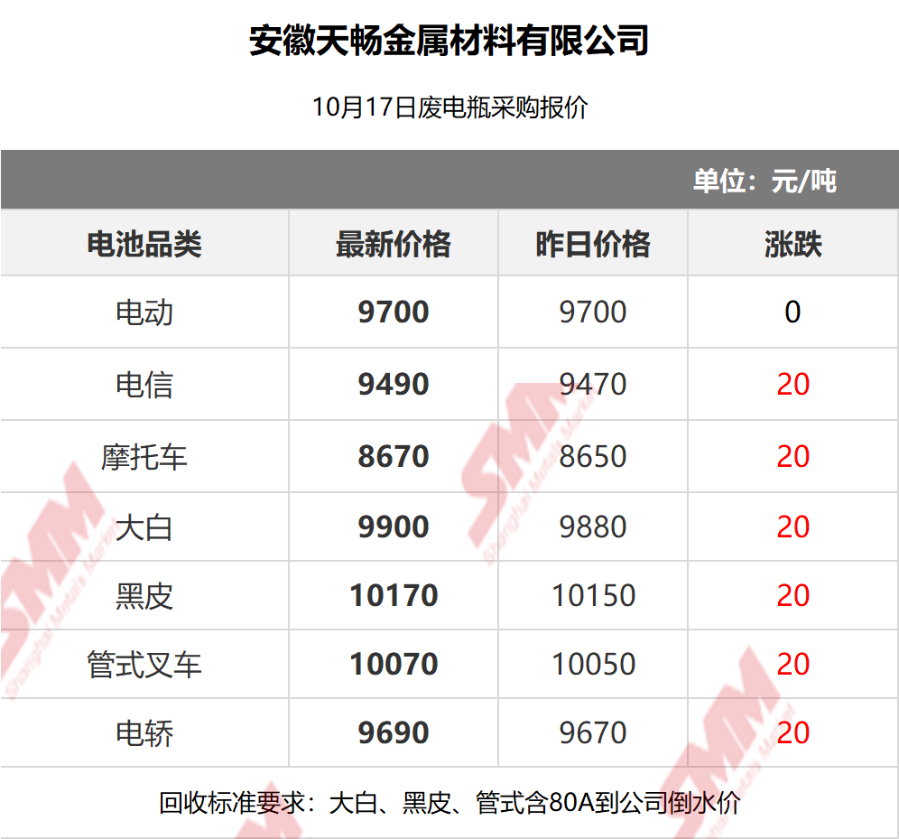 10月17日安徽天畅 废电瓶采购报价