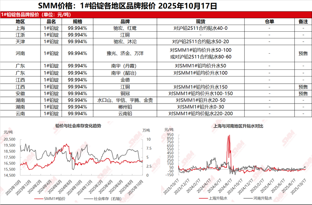 SMM10月17日讯:上海市场驰宏、红鹭铅17000-17060元/吨,对沪铅2511合约贴水40-0元/吨报价。沪铅持续盘整,而现货市场地域性供应偏紧明显,部分持货商开始调货至华东市场,当前现货报价尚少,另偏北方地区电解铅厂提货源紧张,持货商因铅价下跌出现低价惜售情绪,或挺价出货,报价对SMM1#铅均价升水50-100元/吨出厂。另再生精铅报价维持对SMM1#铅均价贴水100-0元/吨出厂,下游企业按需采购,部分因供应偏紧接收高价铅,但更多是观望,其他则以长单采购为主。