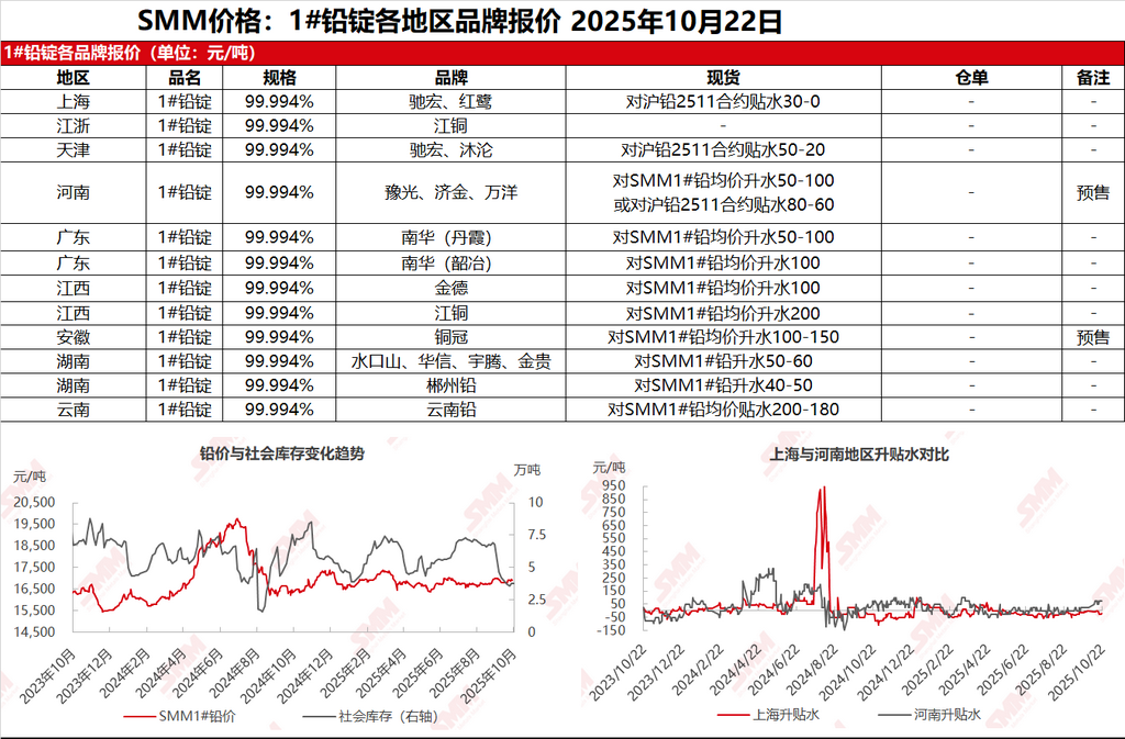 【SMM 上海及其他1#铅市场:地域性供应缺口尚存 市场已预售11月铅锭】 SMM10月22日讯:上海市场驰宏、红鹭铅17130-17170元/吨,对沪铅2511合约贴30-0元/吨报价。沪铅维持高位震荡,且因现货市场流通货源尚少......