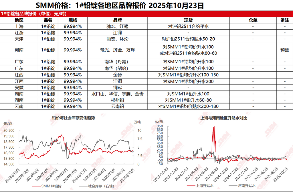 【SMM 上海及其他1#铅市场:沪铅强势飙升现货交易转弱 同时进口铅报价增多】 SMM10月23日讯:上海市场驰宏、红鹭铅17330-17500元/吨,对沪铅2511合约平水报价。沪铅强势上涨,尤其是下半段交易时段,沪铅拉涨至近7个月的高位......