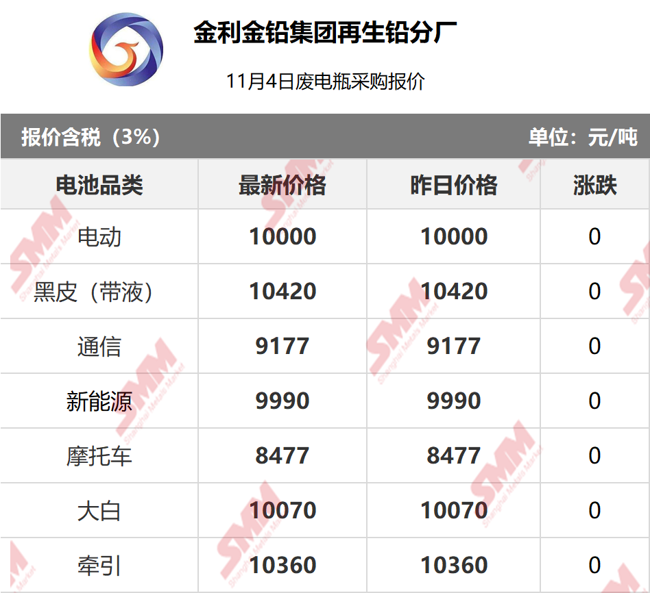 SMM 2025/11/4 国内知名再生铅企业废电瓶采购报价