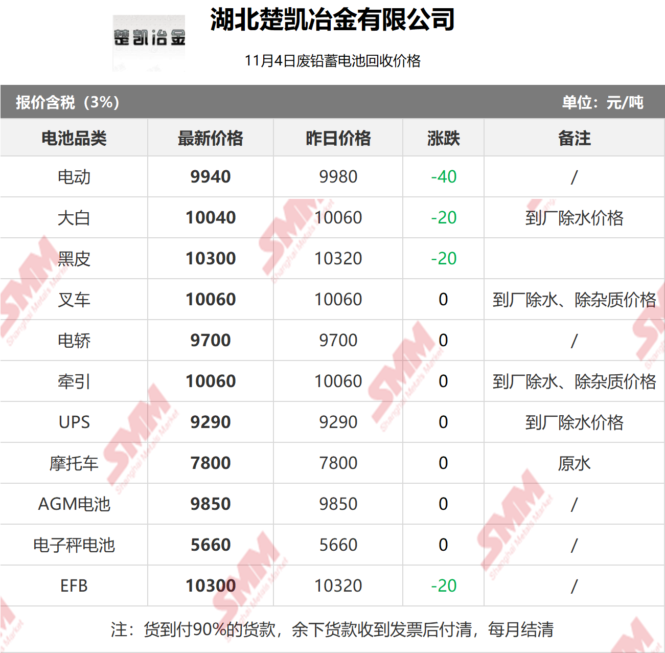 SMM 2025/11/4 国内知名再生铅企业废电瓶采购报价
