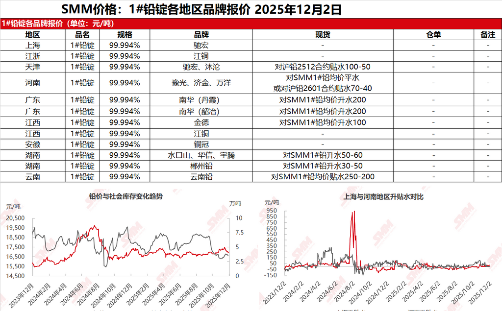 SMM12月2日讯:上海市场铅锭货源不多,部分持货商短时间已无可售现货,遂暂停报价。而电解铅厂提货源相对充裕,持货商多积极报价出货,部分报价贴水较昨日扩大20-30元/吨(对沪铅2601合约),对SMM1#铅均价则保持在升水0-50元/吨出厂,另再生铅企业出货相对增多,加之部分进口铅到港报价出货,下游企业采购选择较多,对于厂提货源青睐度下降,成交转淡。