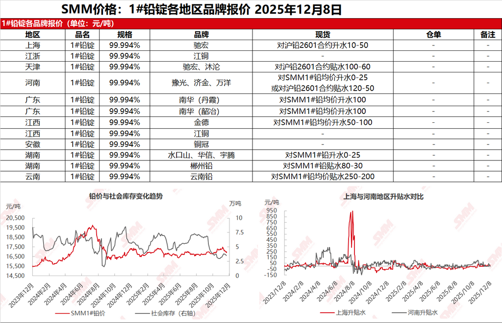 【SMM 上海及其他1#铅市场:沪铅呈偏强震荡 而持货商扩贴水出货】 SMM12月8日讯:上海地区驰宏铅报17305-17365元/吨,对沪铅2601合约升水10-50元/吨,江浙沪市场流通货源依然有效,同时持货商积极出售厂提货源......