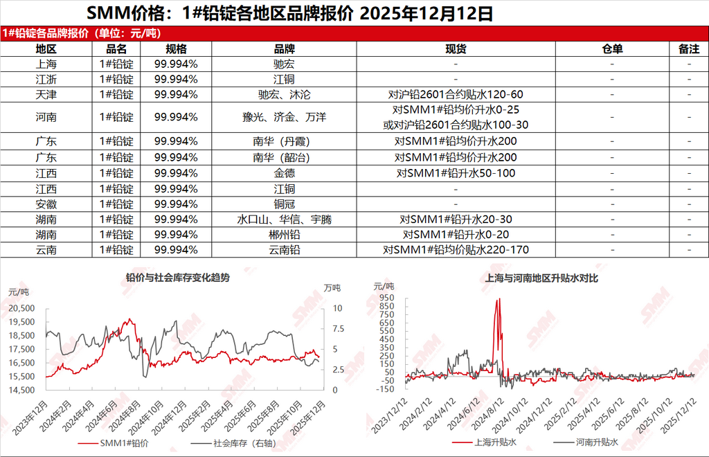 【SMM 上海及其他1#铅市场:铅价呈偏弱震荡 现货市场地域性成交存差异】 SMM12月12日讯:江浙沪地区铅锭仓单货源有限,持货商报价稀少,大部分以出厂提货源为主。今日沪铅铅价再度下跌,部分持货商出现低价惜售情绪......