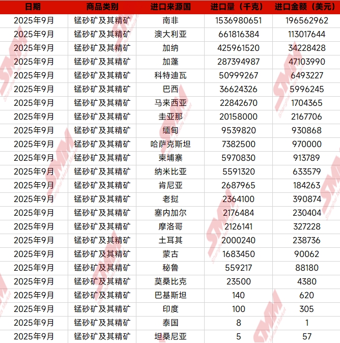 SMM统计2025年9月我国锰矿总进口量为308.49万吨,环比减少11.50%,同比增加12.98%
