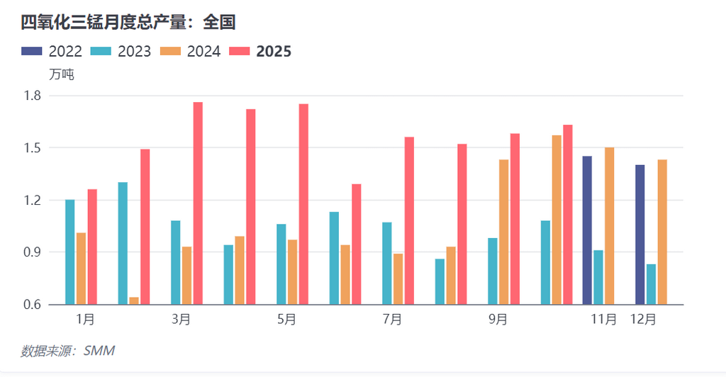 2025 年 10 月,四氧化三锰产量呈现环比小幅增长态势。