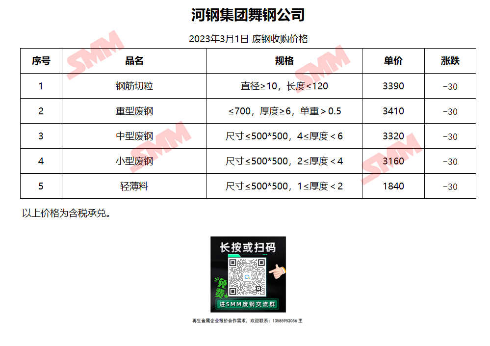 3月1日 河钢集团舞钢公司 废钢收购报价