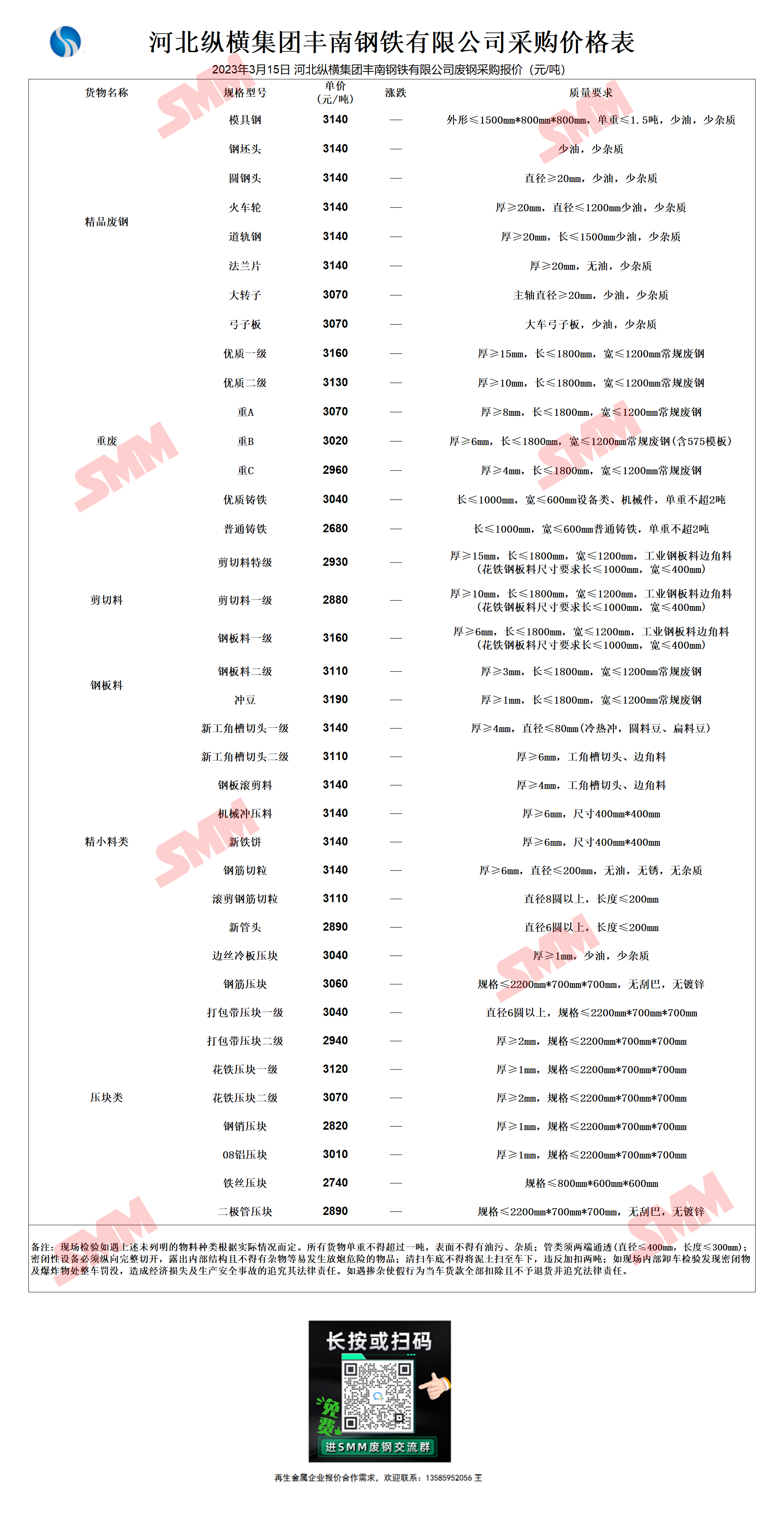 3月15日河北纵横集团丰南钢铁 废钢采购报价