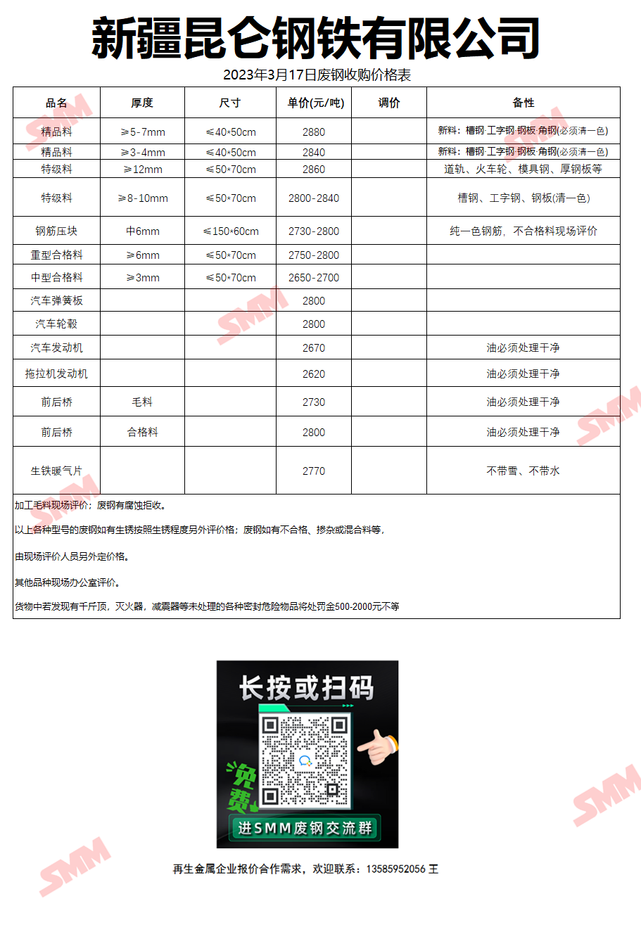 3月17日新疆昆仑钢铁 废钢收购报价