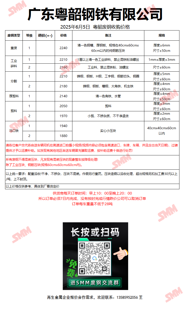 6月5日广东粤韶 废钢收购报价