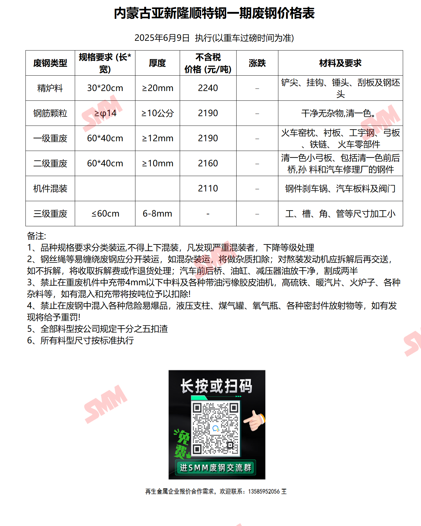 6月9日内蒙古亚新隆顺特钢一期 废钢收购报价