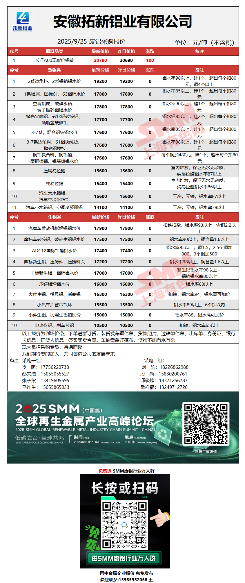 今日拓新铝业 废铝采购报价已更新,有货的朋友欢迎联系我们!