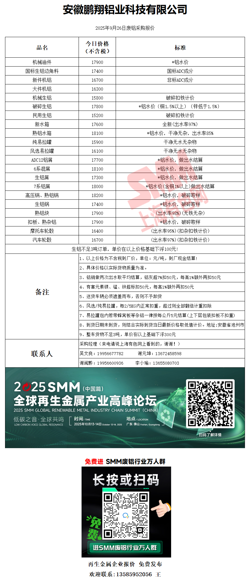 今日安徽鹏翔 废铝采购报价已更新,有货的朋友欢迎联系我们!