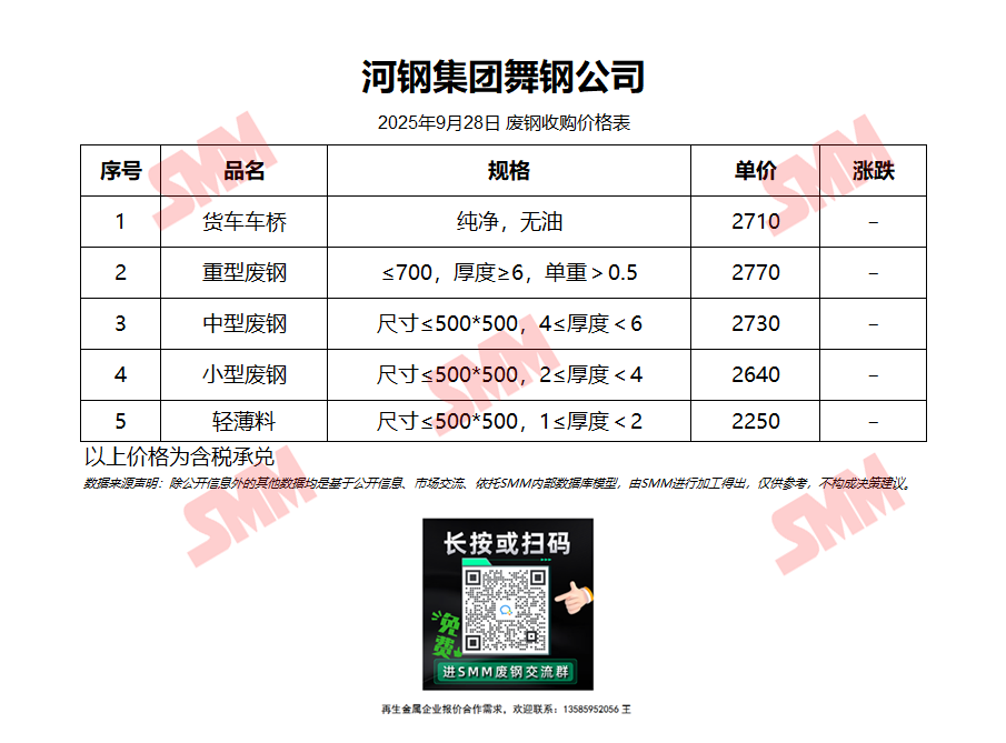 9月28日河钢集团舞钢公司 废钢收购报价