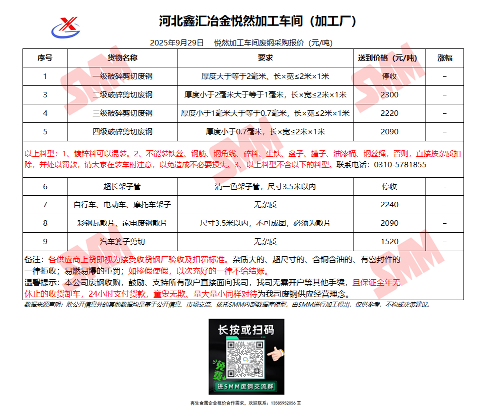 9月30日河北鑫汇冶金悦然加工车间 废钢采购报价
