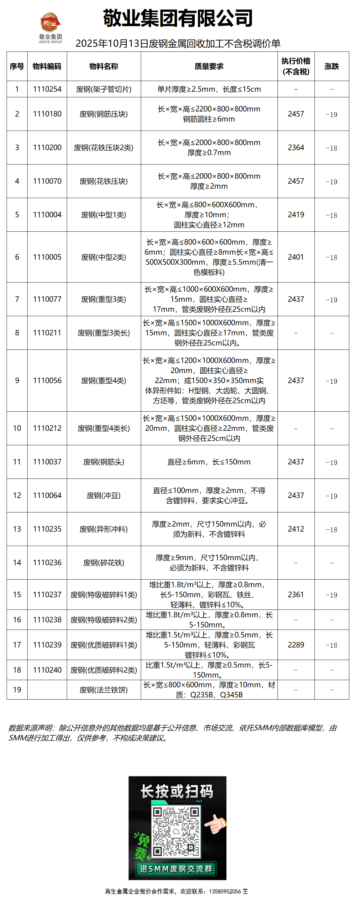 10月13日10时00分 敬业钢铁本部 废钢采购报价