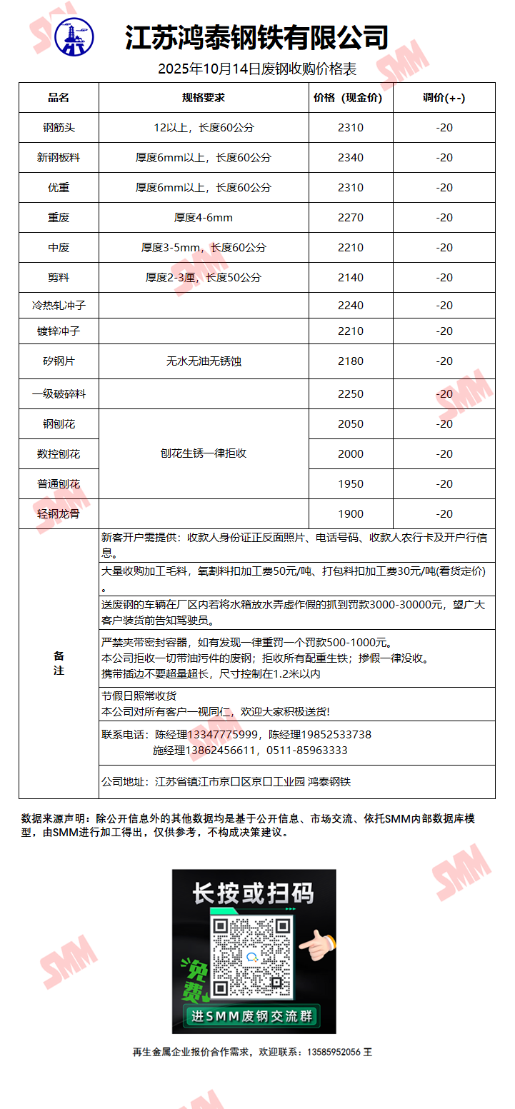 10月14日江苏鸿泰钢铁 废钢收购报价
