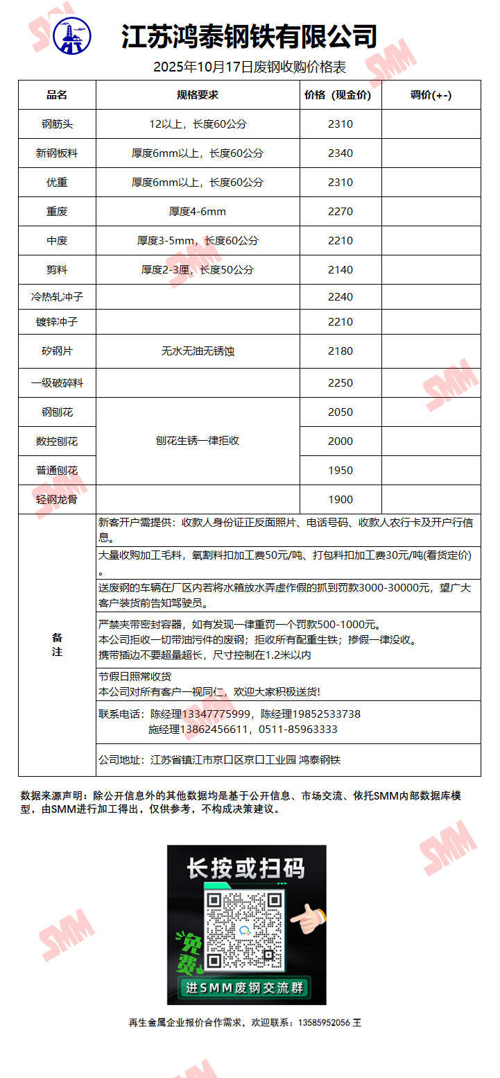 10月17日江苏鸿泰钢铁 废钢收购报价