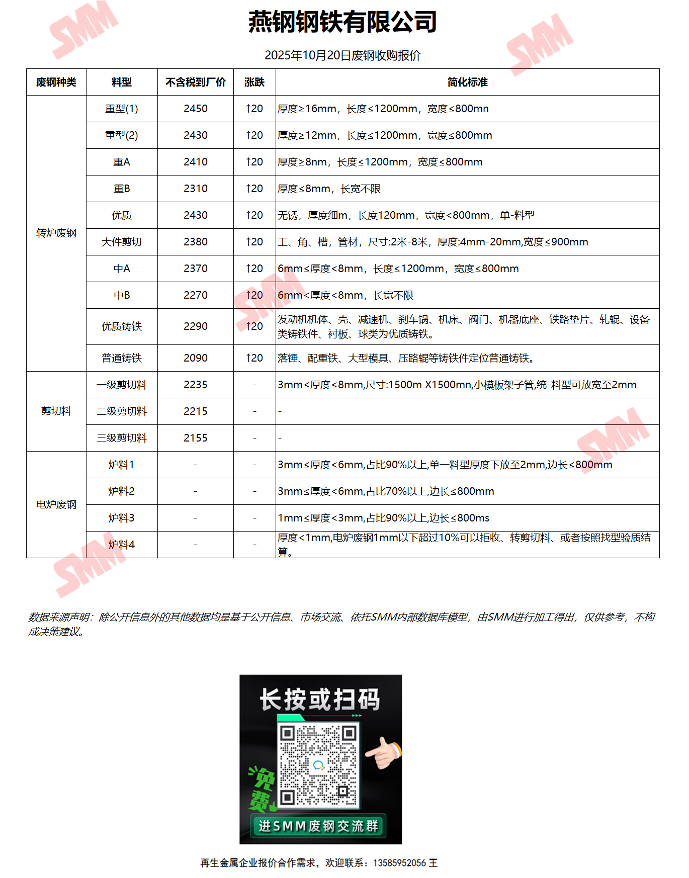10月20日12时00分 敬业钢铁(孟耳庄园区) 废钢采购报价