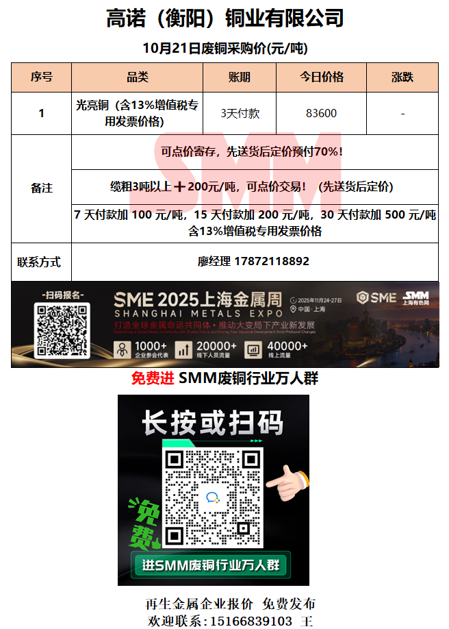 10月21日高诺(衡阳)铜业 废铜采购报价